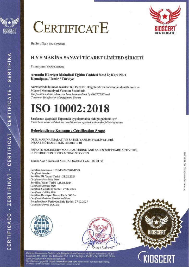 Toplam Kalite Yönetimi felsefesini benimseyerek, tüm faaliyetlerimizi düzenli bir şekilde gözden geçiriyor ve sürekli iyileştirme anlayışıyla büyümemizi sürdürüyoruz. HYS’de, kurumsal değerlerimiz doğrultusunda, saygılı, hoşgörülü ve empatik bir çalışma ortamı sağlamak, çalışan memnuniyetini en üst düzeyde tutmak önceliğimizdir.